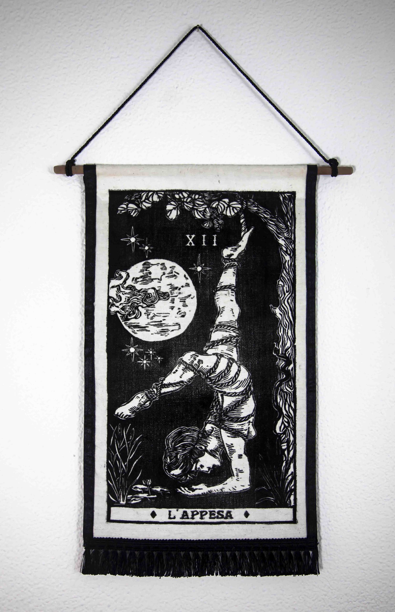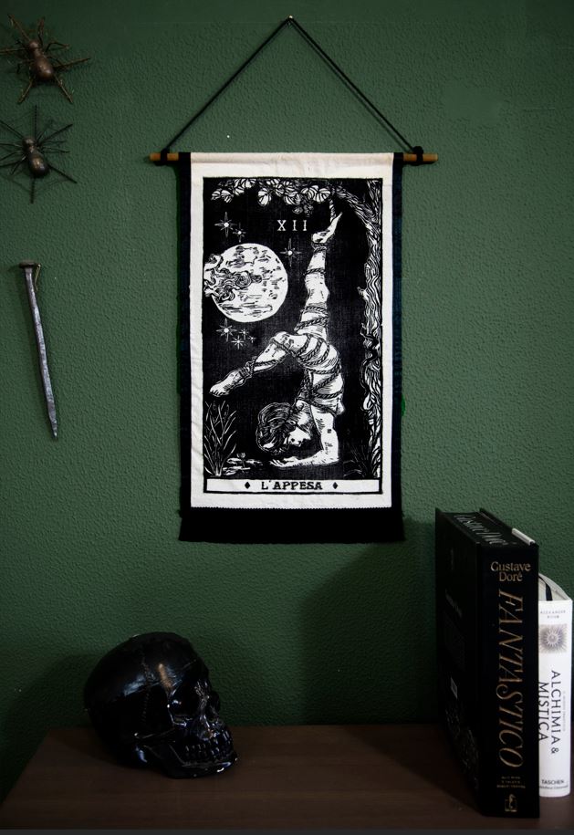 L’arazzo “L’Appesa – XII” è un disegno originale inciso su linoleum che raffigura la Lama numero 12 dei Tarocchi. L’immagine raffigura una donna vittoriana sospesa per una caviglia a un ramo dell’Albero della Conoscenza, legata con la tecnica dello shibari, una pratica meditativa che trasforma la vulnerabilità in apertura. Il serpente simboleggia il femminile, così come la Luna, in fase di plenilunio.