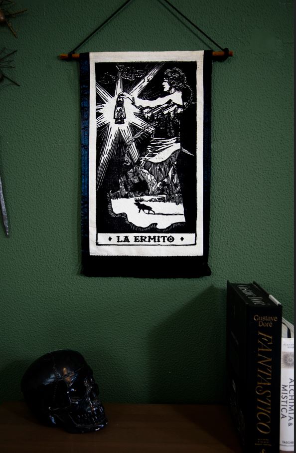 Il medesimo soggetto è presente anche su carta pergamena, su questo link: https://monstera-ink.com/prodotto/la-ermito-ix-the-research/ o in quest’altra versione: https://monstera-ink.com/prodotto/la-ermito-ix-arazzo-con-fiore/