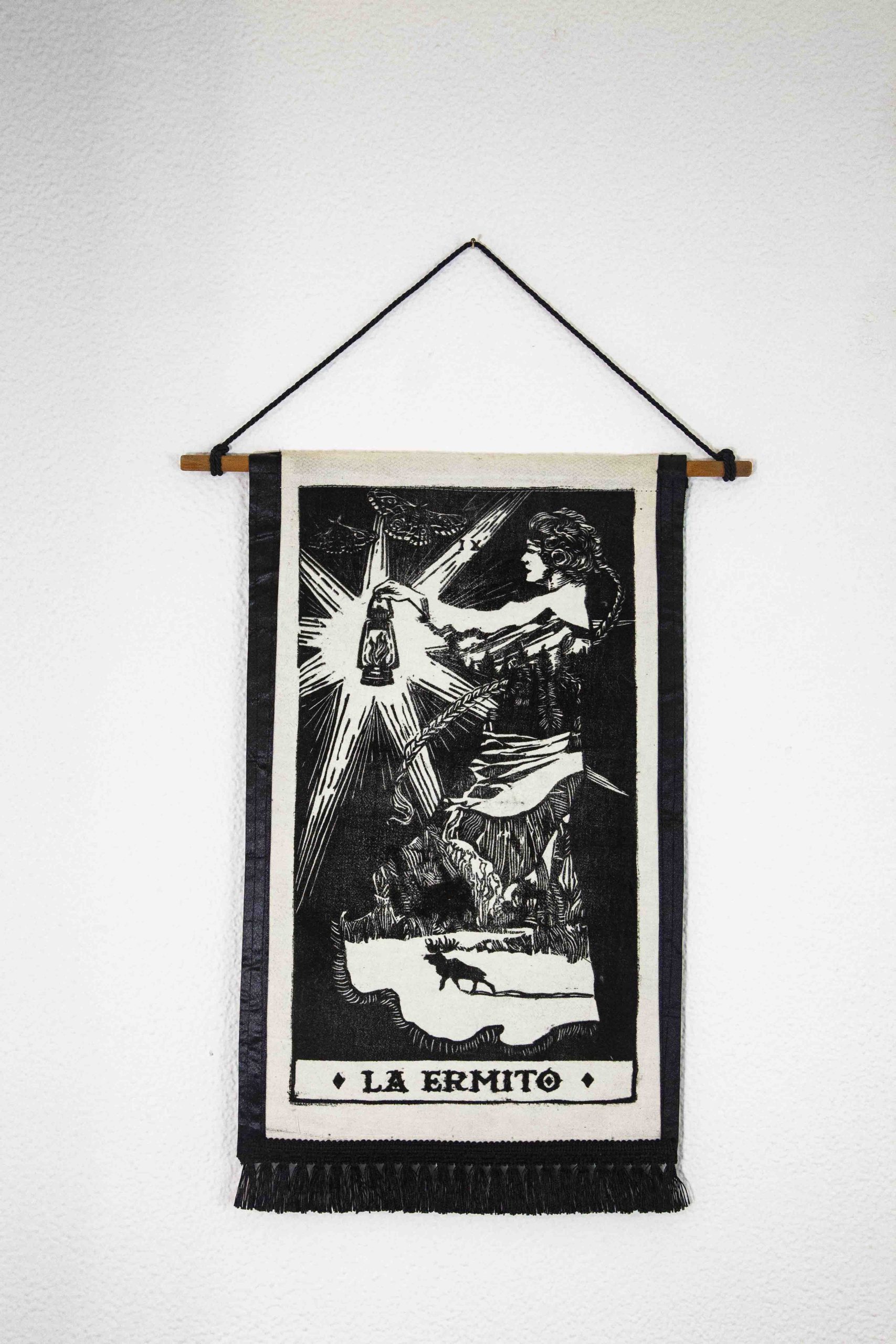 “La Eremito – IX ” è incisa a mano, è stampata cotone. Rappresenta la nona Lama dei Tarocchi, raffigura una donna sospesa nella notte oscura. La luce, proveniente dalla sua torcia, emana nove raggi, in riferimento al numero dell’Arcano stesso. Nel mantello de La Ermito è rappresentato un paesaggio montano naturale, ai piedi del quale si trova una solitaria renna che segue la luce della torcia. La natura simboleggia il tutto, l’equilibrio e l’essenziale. La Ermito possiede già tutto dentro di sé e la sua solitudine è necessaria per guardare dentro sé stessa : la torcia, infatti, non illumina l’esterno ma l’interno, perchè invita all’introspezione e alla conoscenza di sé. Le falene, raffigurate in alto a sinistra con occhi sulle ali, sono simbolo di conoscenza ma anche di follia.