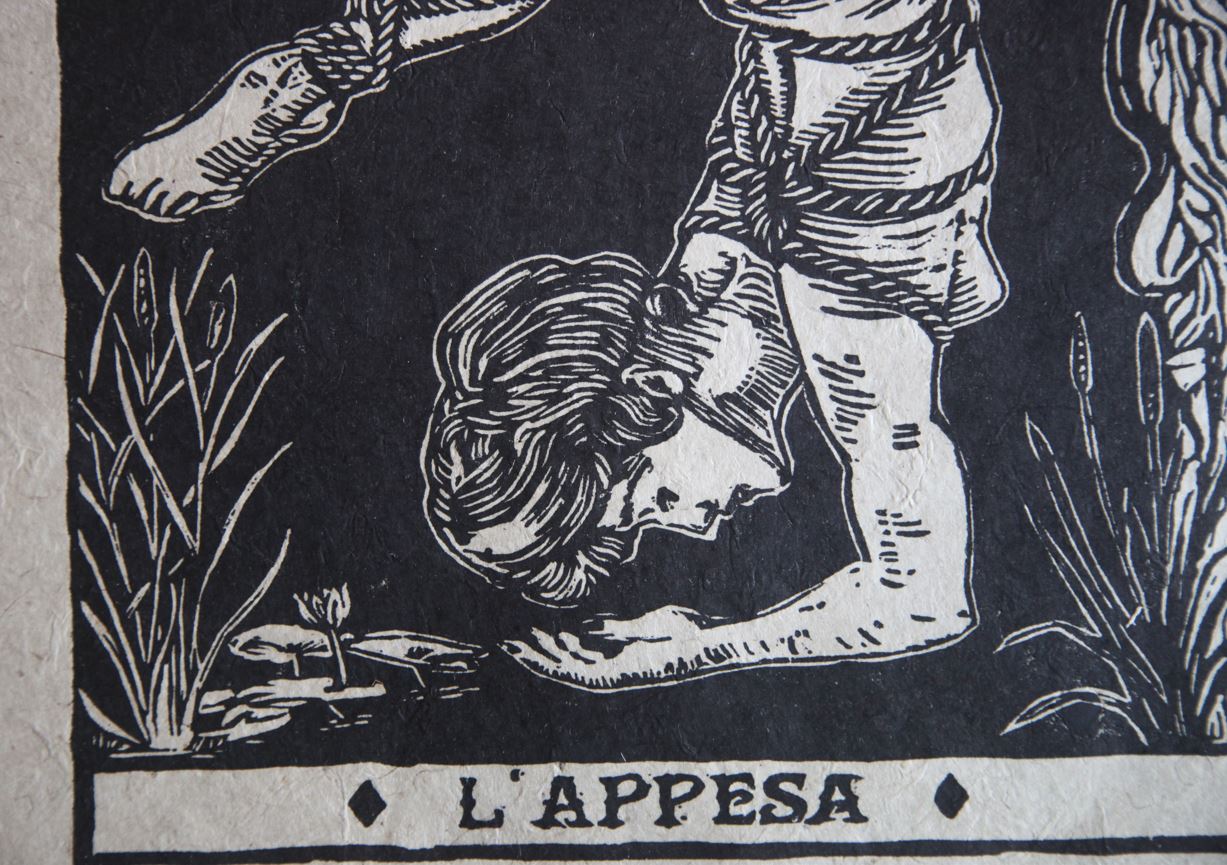 L’opera “L’Appesa” è un’interpretazione del dodicesimo Arcano Maggiore dei Tarocchi. L’Appesa – XII – The Choice raffigura una donna vittoriana sospesa per una caviglia a un ramo dell’Albero della Conoscenza, legata con la tecnica dello shibari, una pratica meditativa che trasforma la vulnerabilità in apertura. Il serpente simboleggia il femminile, così come la Luna, qui in fase di plenilunio.