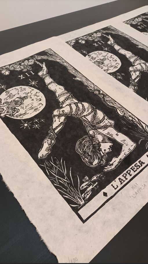 L’Appesa – XII si colloca a metà dei 22 Arcani Maggiori, suggerendo una scelta di prospettiva, un ribaltamento del sistema. In un contesto di ingiustizia, dove i giusti soccombono e i potenti prevalgono, la figura si lascia appendere a testa in giù, invitando a leggere il mondo in modo differente. L’Appesa è un gioco di creatività, di magia, di inganno e di consapevolezze. Apparentemente in antitesi con “La Diablo” https://monstera-ink.com/prodotto/la-diablo-xv-the-transformation-stampa-darte/   “L’Appesa” invita a considerare la realtà da un punto di vista alternativo, abbracciando la vulnerabilità come forza.