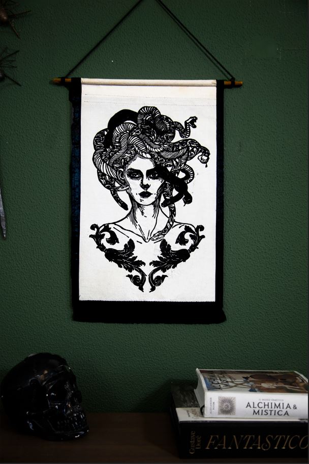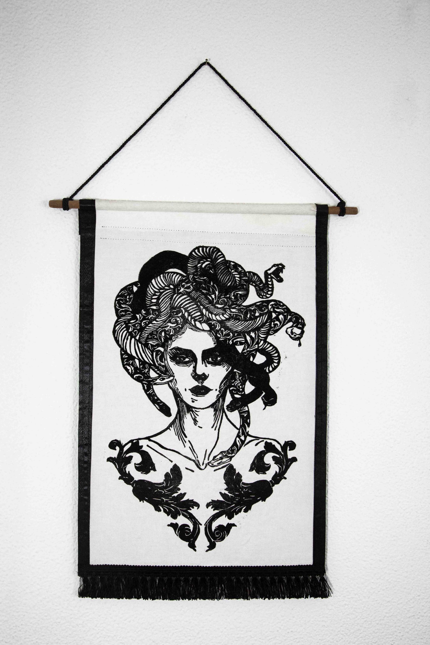 “Medusa” è una xilografia su cotone e raffigura la gorgona più conosciuta di sempre, il mostro per eccelenza. Il mito di Medusa incarna l’ambivalenza tra attrazione e pericolo. Un tempo bellissima, viene trasformata in un mostro con serpenti al posto dei capelli e lo sguardo che pietrifica gli uomini. Medusa incarna il paradosso della femminilità mostruosa: spaventosa proprio perché impossibile da ignorare.