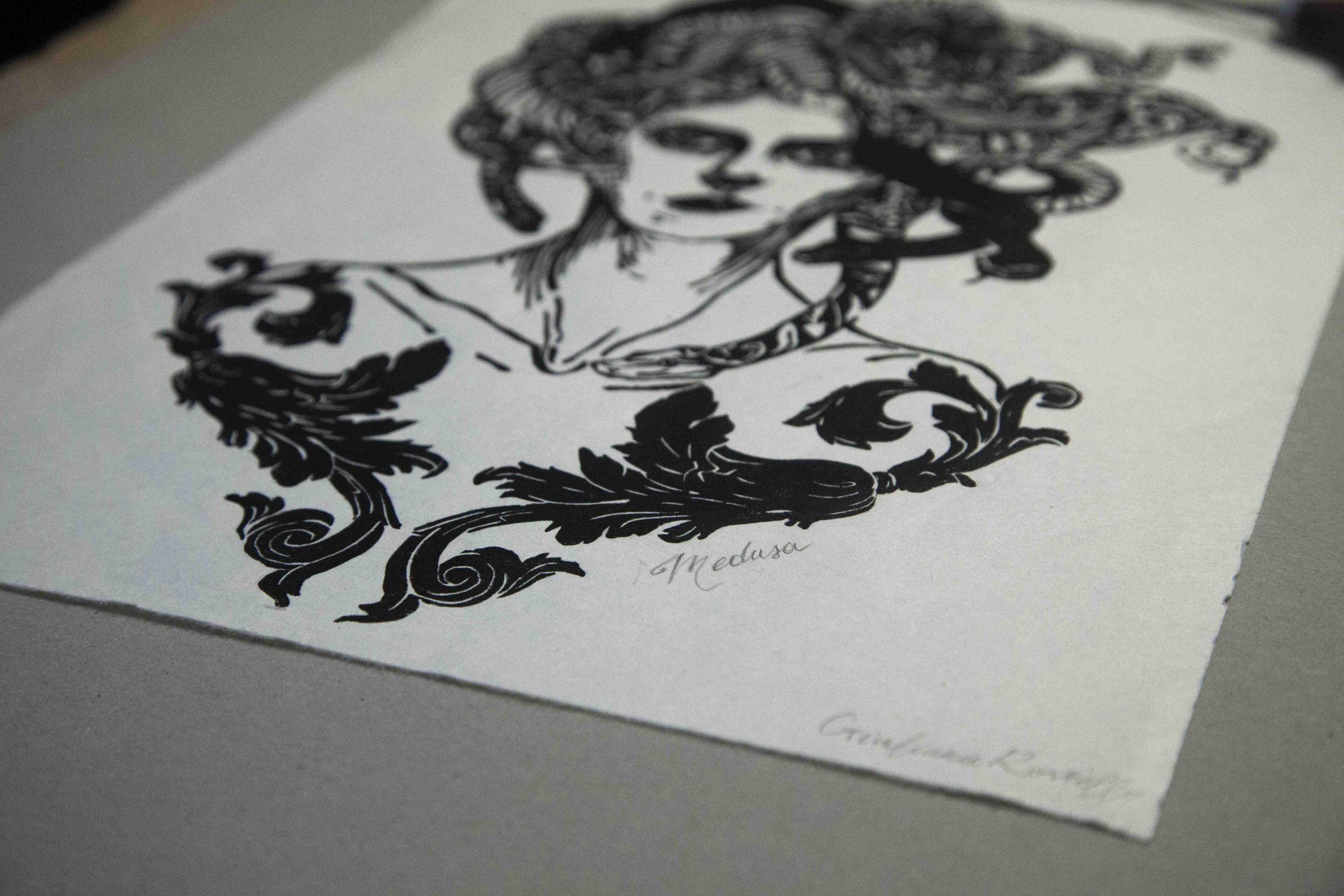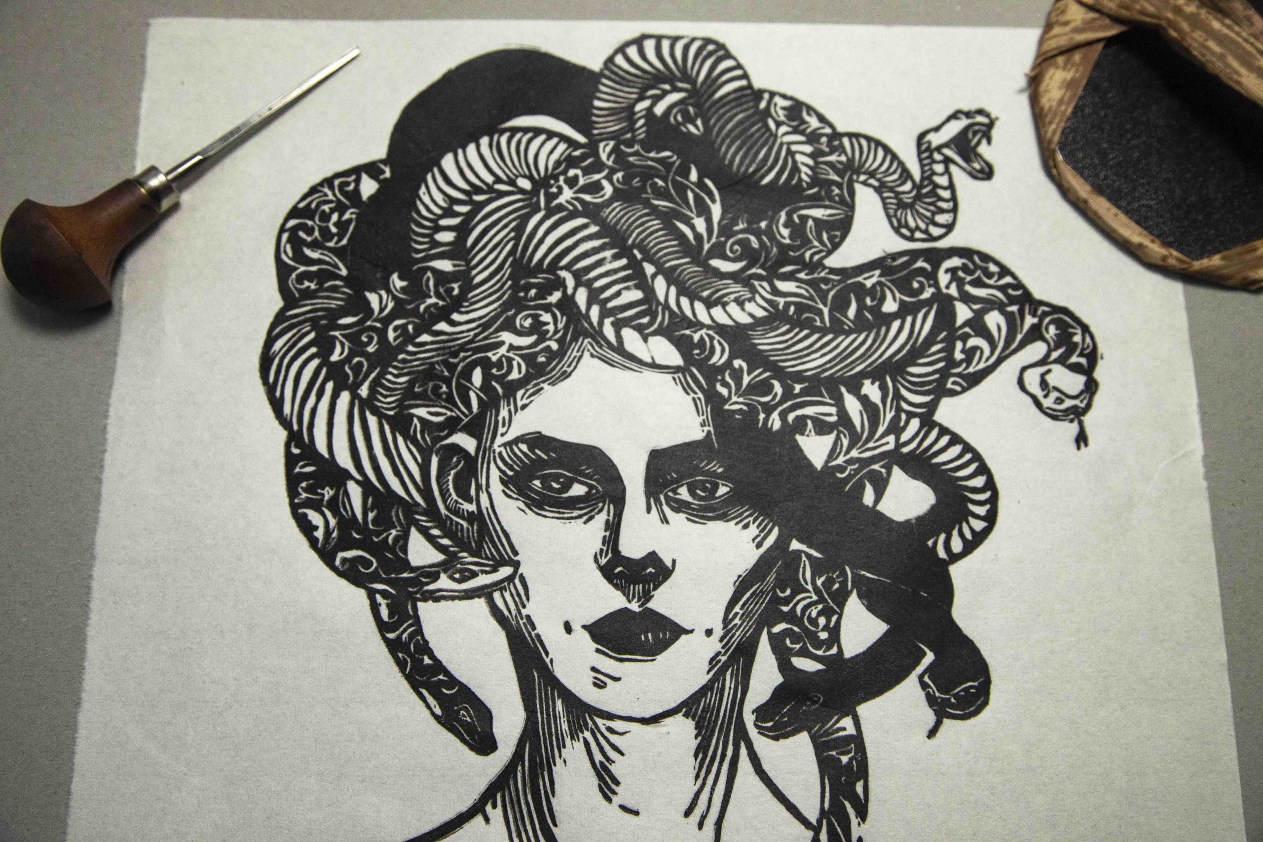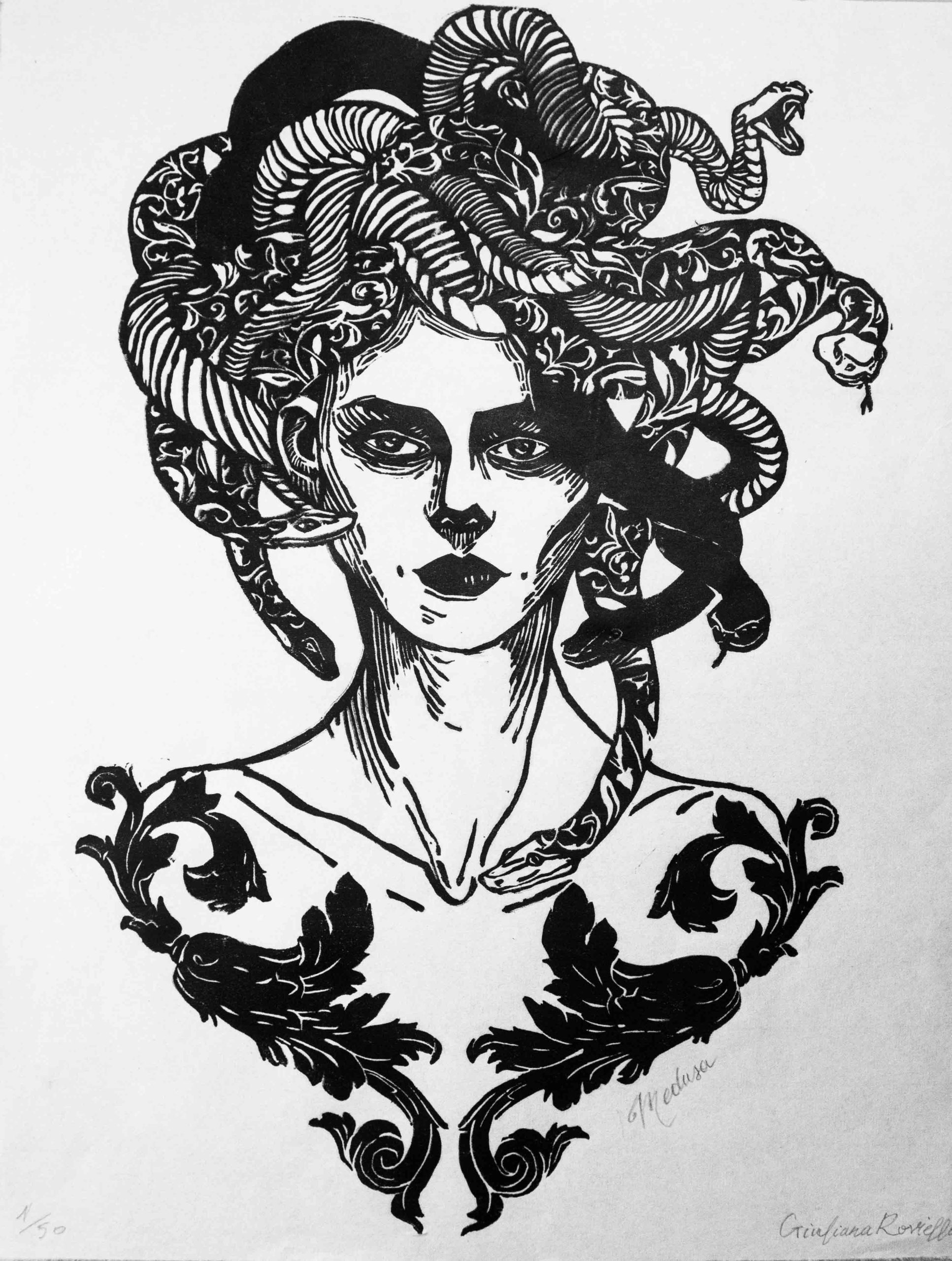 “Medusa” è una xilografia su carta di riso e raffigura la Gorgona più conosciuta di sempre, il mostro per eccelenza. Il mito di Medusa incarna l’ambivalenza tra attrazione e pericolo. Un tempo bellissima, viene trasformata in un mostro con serpenti al posto dei capelli e lo sguardo che pietrifica gli uomini. Medusa incarna il paradosso della femminilità mostruosa: spaventosa proprio perché impossibile da ignorare.