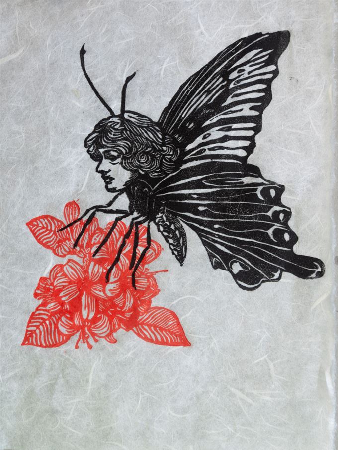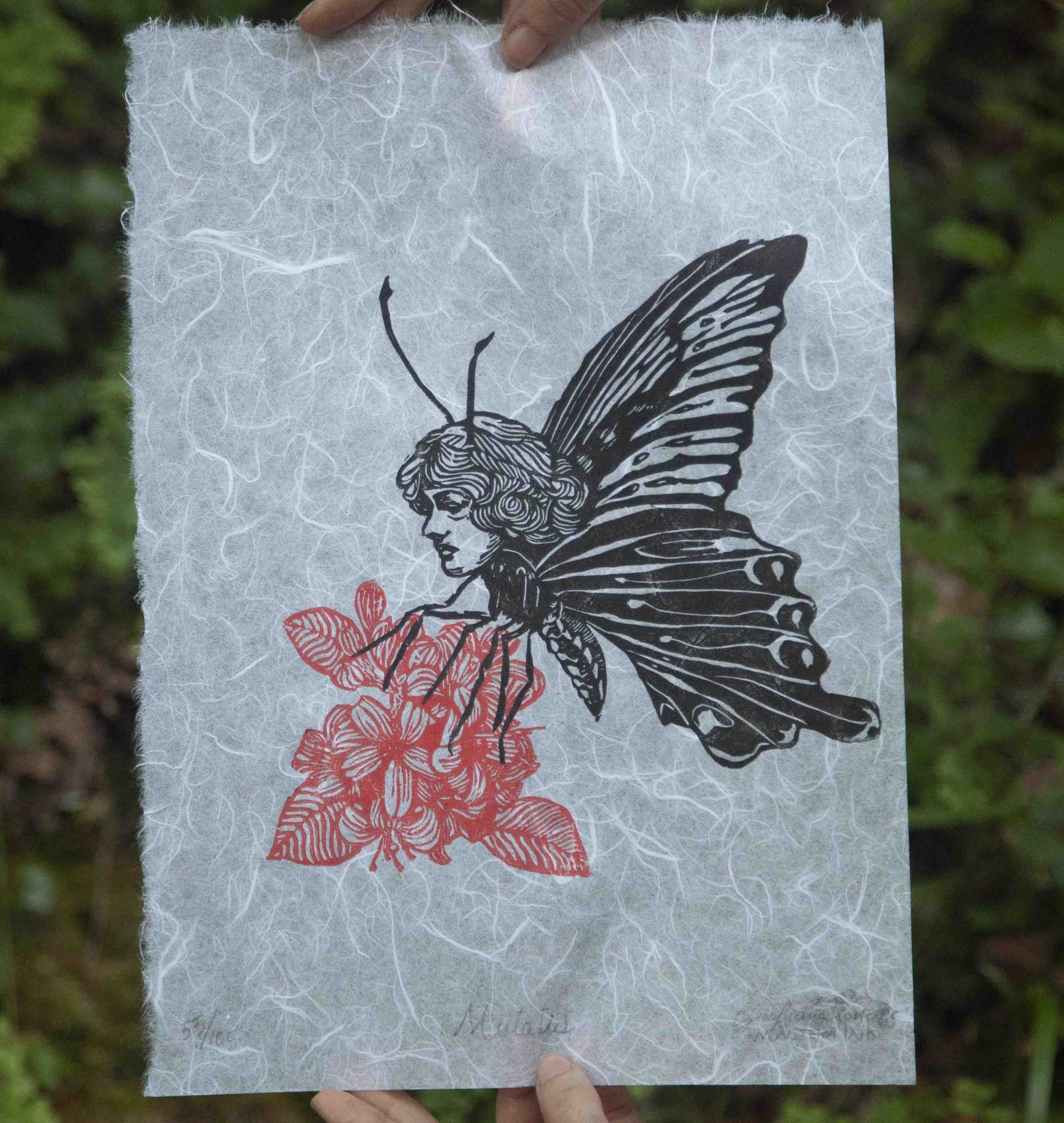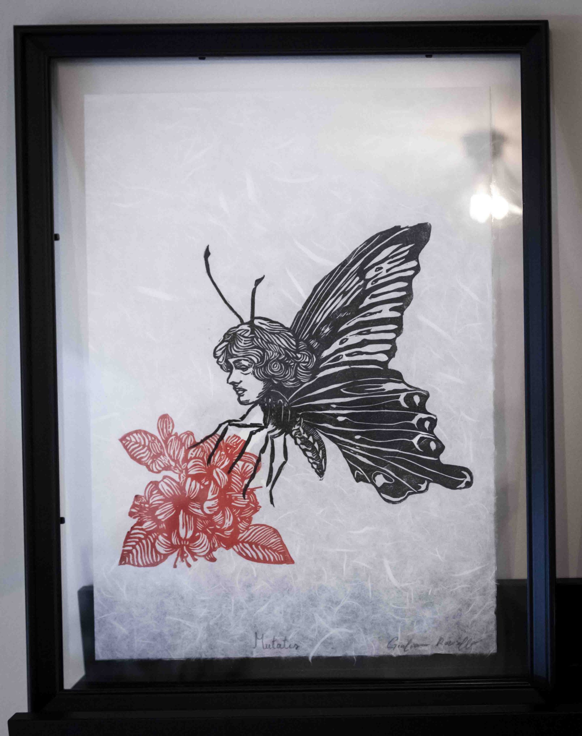 “Mutatis” è una stampa linololeografica su carta di riso e raffigura un’ antropomorfa metà umana e metà farfalla, posata su dei fiori rossi, stampati in doppia battuta. Esprime un’etità ibrida, libera e fluida ed invita ad accettare e avere fiducia nel proprio processo (creativo o di cambiamento).  Si ispira a questo passo delle Metamorfosi di Ovidio: