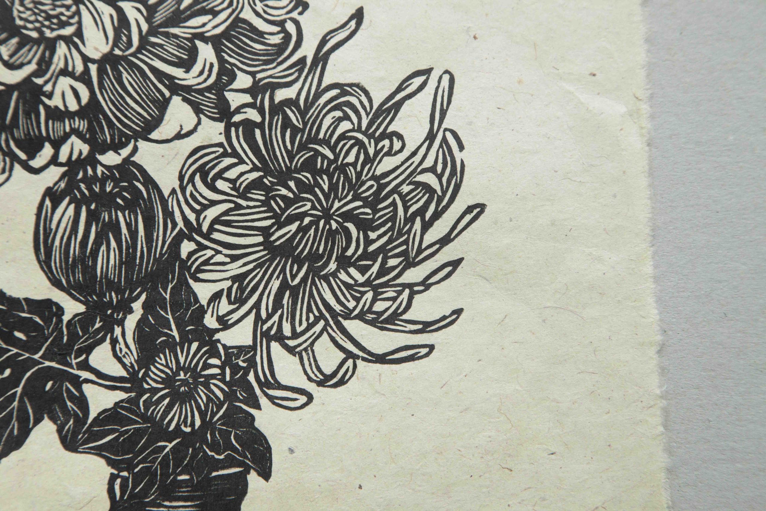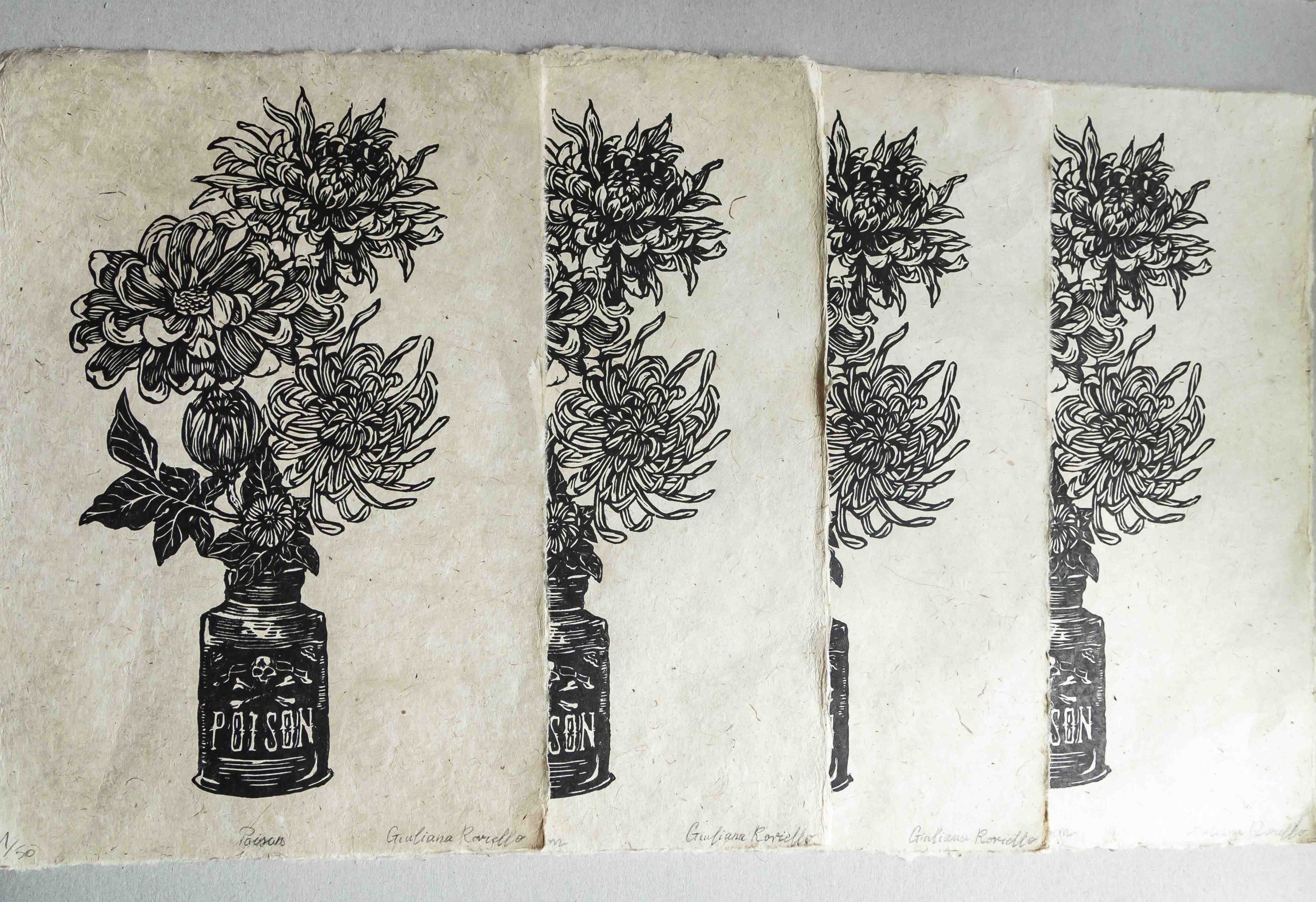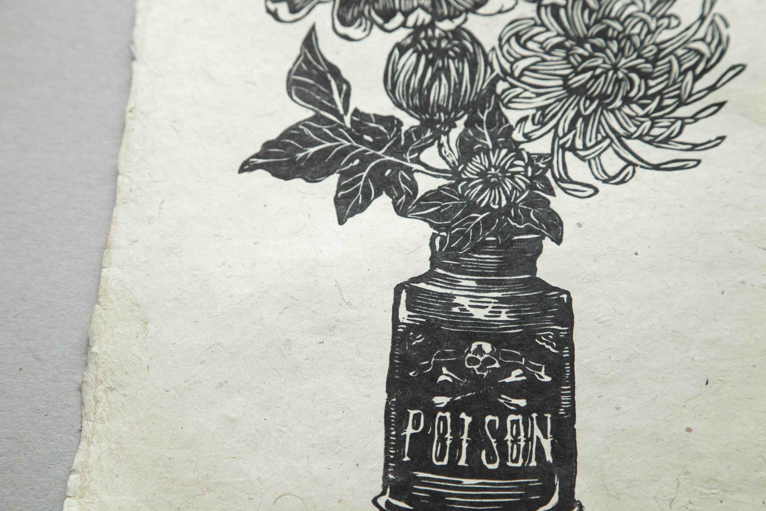 Poison è una xilografia su carta arigianale e raffigura rigogliosi fiori di crisantemi e peonie in un vaso contenete veleno. Quest’opera si ispira a l’opera letteraria “I fiori del del male”, di C. Baudelaire. Rappresenta la sottile linea che c’è tra il riscatto e la difatta: il male non viene solo per nuocere, ciò che è negativo può far fiorire una nuova condizione migliore: una crisi, una rivoluzione può rivelarsi rigenerativa.